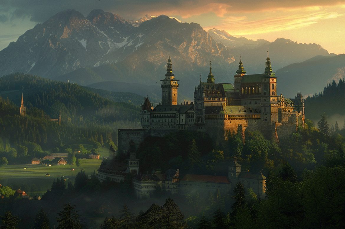 1880’s matte painting of an Austrian castle. Evening. Realistic. Castle on hilltops. Mountain in background. –ar 16:9